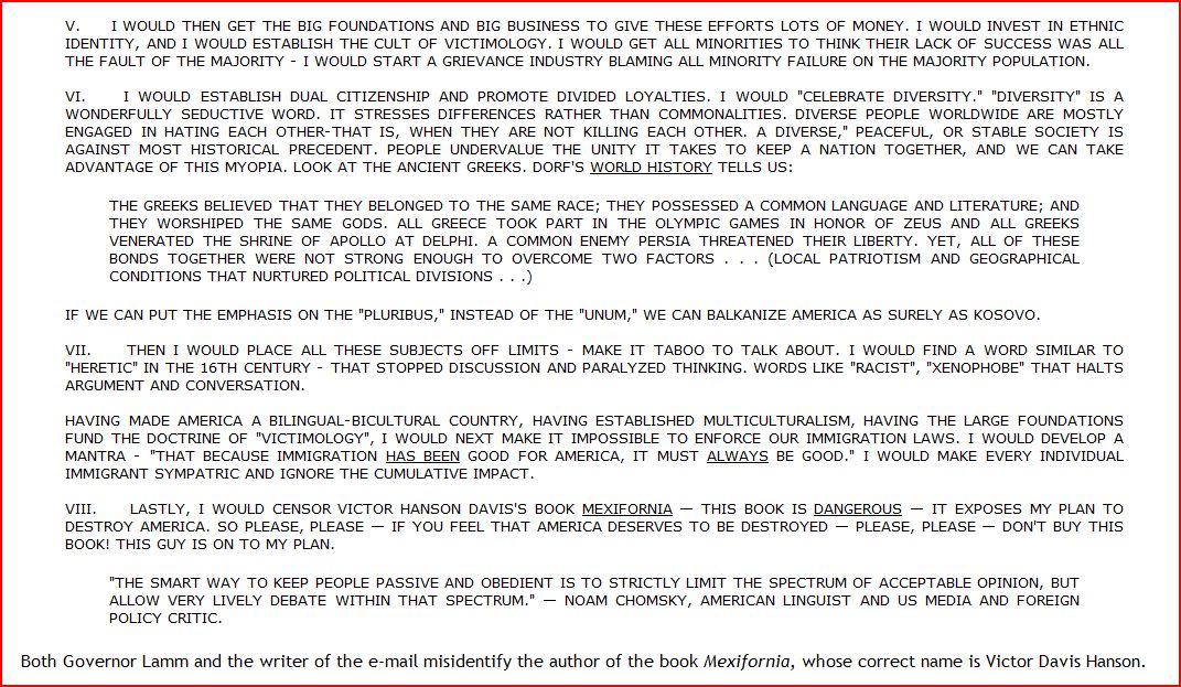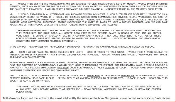 In the last  minute of his speech, Governor Lamm wiped his brow. Profound silence  followed. Finally he said, “Lastly, I would censor  Victor Hanson Davis’s book “Mexifornia.”  His book  is dangerous.  It exposes the plan to destroy America. If you  feel America deserves to be destroyed, don’t read that  book.”